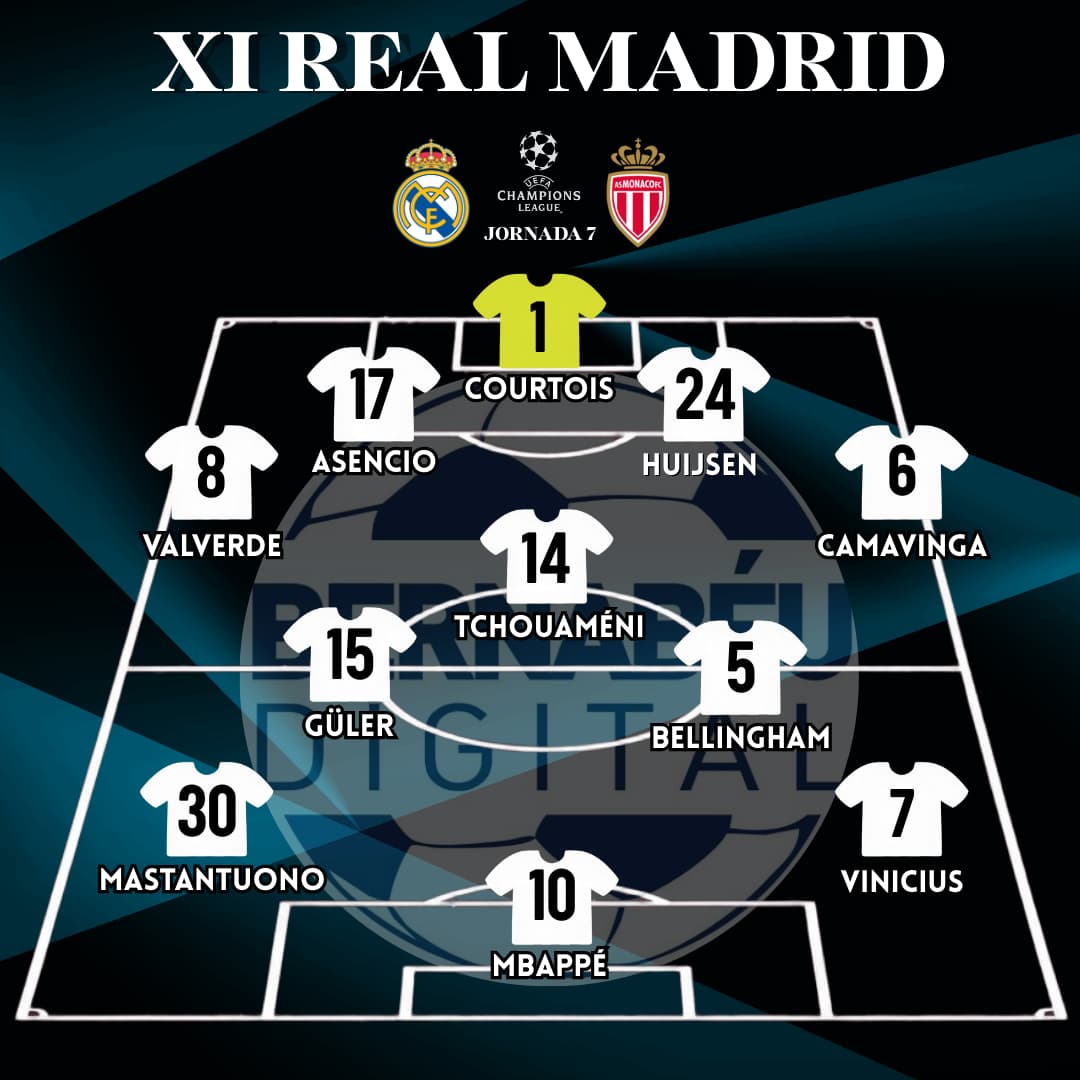 ¡Alineación confirmada en el Real Madrid! El primer once titular de Álvaro Arbeloa en Champions al frente de la nave madridista consiste en Thibaut Courtois bajo palos; defensa formada por Valverde, Asencio, Huijsen y Camavinga; centro del campo para Tchouaméni, Bellingham y Arda Güler; y arriba, Mastantuono, Vinicius y Mbappé.