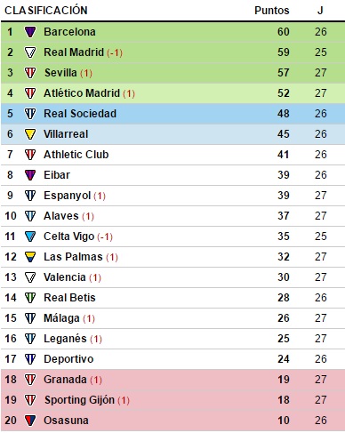 El Atlético de Madrid consiguió ganar en los últimos minutos con un gol de Antoine Griezmann, y esto les mantiene cuartos y una jornada más por delante de la Real Sociedad y ocupando la cuarta plaza. Además, se acerca a los puestos de clasificación directa a Champions League tras el empate del Sevilla ante el Leganés.