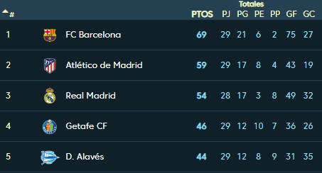 Tras el final de la jornada del sábado, la clasificación ha quedado de la siguiente forma. El Barça se mantiene en lo alto de la clasificación y ya acaricia otra liga. El Atlético de Madrid se mantiene segundo tras la victoria ante el Alavés en Mendizorroza.