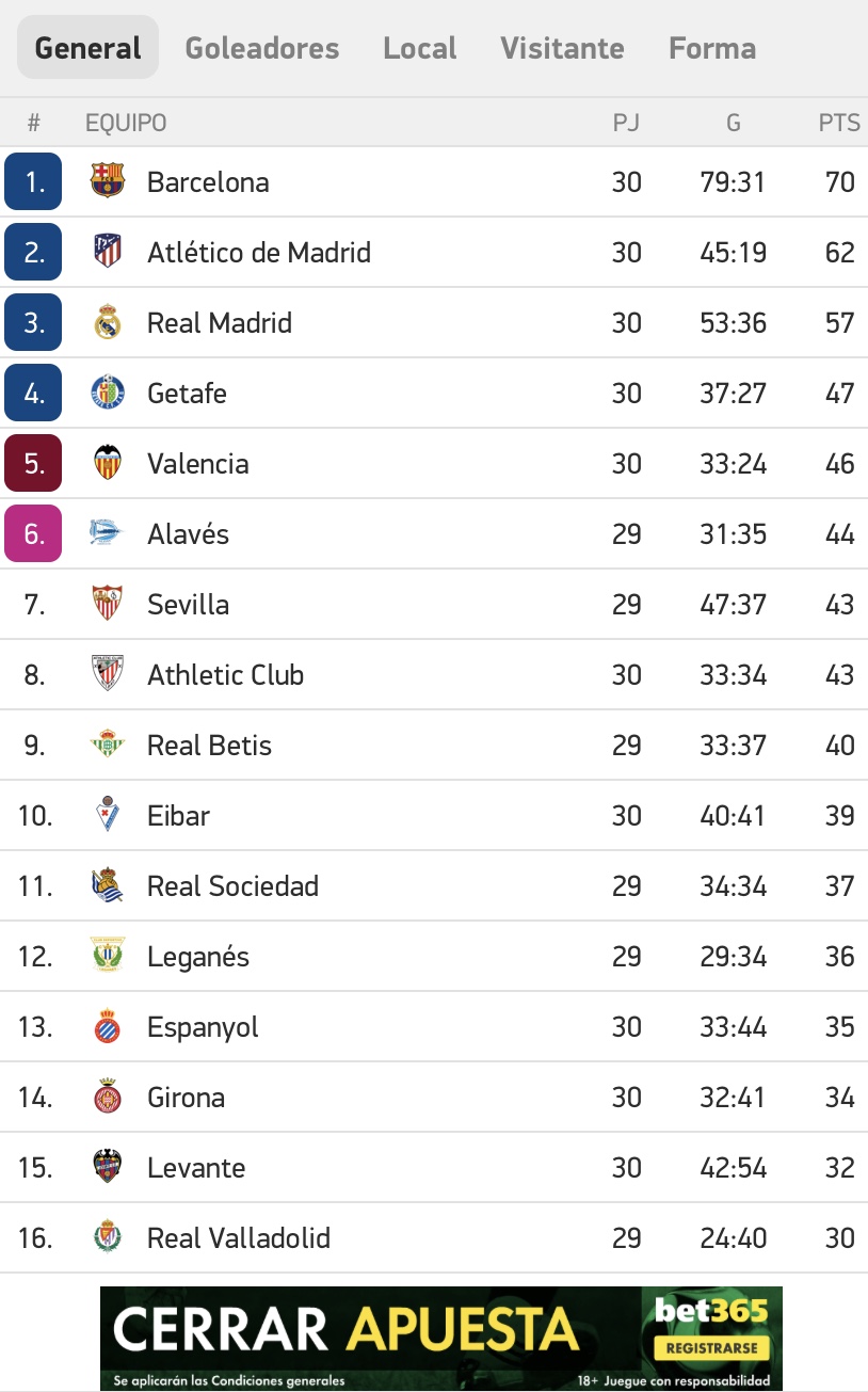CLASIFICACIÓN - El Madrid se aleja a 5 puntos de la segunda plaza