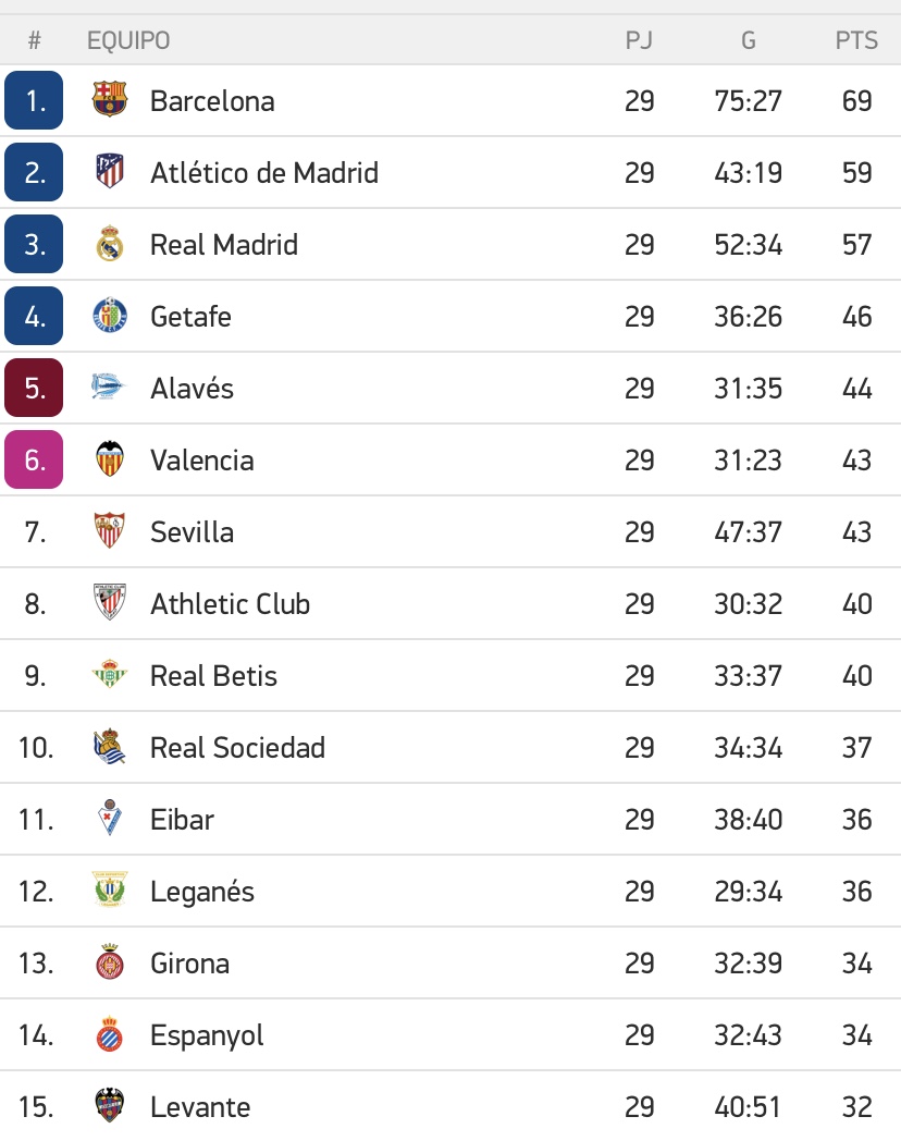 Ganaron todos los equipos de la parte alta, menos el Getafe. El Madrid con esta victoria sigue a solo dos puntos del Atlético de Madrid que también ganó en la jornada de sábado. Por su parte, el Barcelona mantiene la distancia de 10 puntos con el segundo clasificado.