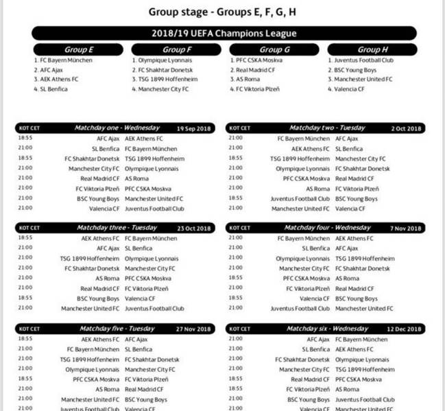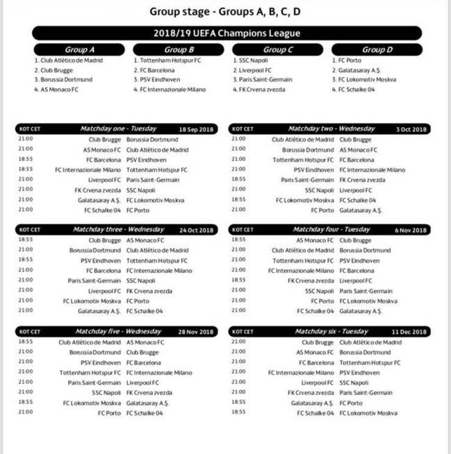 La UEFA acaba de dar a conocer el calendario completo de la fase de grupos de esta nueva edición de la Champions League 2018-2019. Debajo las fotos con el calendario: