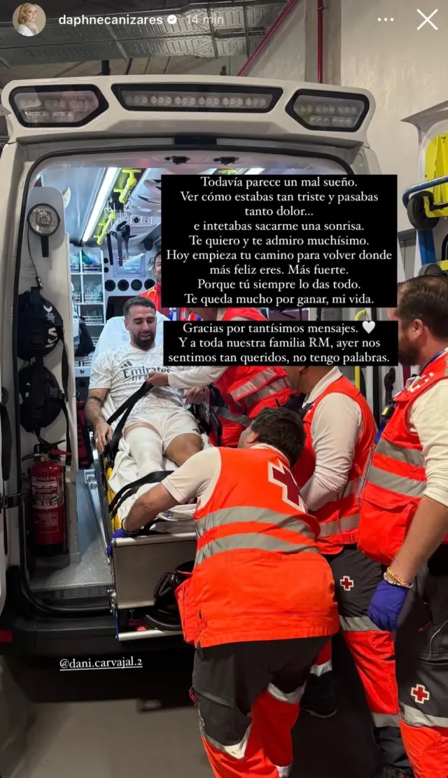Después de conocer la fatídica noticia, Daphe Cañizares subió una storie a Instagram, haciendo latente su dolor por la grave lesión de su marido y padre de sus hijos. "Todavía parece un mal sueño. Ver cómo estabas tan triste y pasabas tanto dolor… e intentabas sacarme una sonrisa", comienza la mujer de Carvajal en un mensaje en el que también anima al futbolista del Real Madrid, mientras recalca su cariño y su admiración por el madridista: