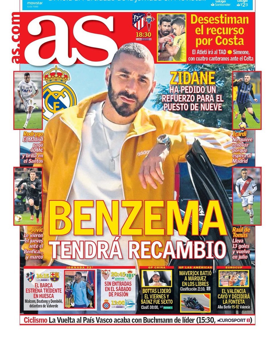 El diario As destaca que Zinedine Zidane "ha pedido un refuerzo para el puesto de 'nueve'". El rotativo apunta cuatro nombres en su portada, Rodrygo del Santos, ya contratado, Raúl de Tomas, cedido al Rayo Vallecano, Mauro Icardi del Inter y Luka Jovic del Eintracht Frankfurt.