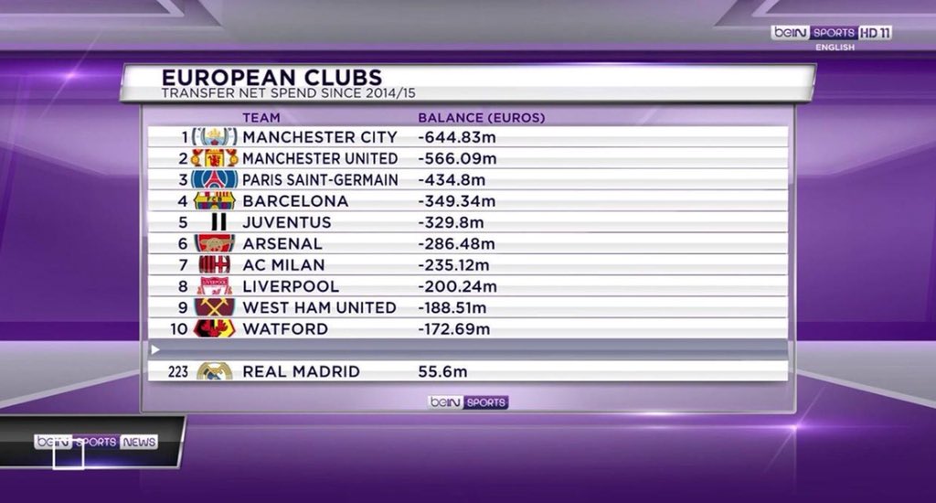 Bein Sports ha recopilado el gasto de clubes europeos en los últimos 3 años. Sorprende el gasto del club blanco, habiendo gastado solamente 55,6 millones de euros, una cantidad que le ubica fuera del TOP-200, precisamente en el puesto 223. Una política que le ha llevado al éxito y la supremacía en Europa en los últimos años, y sobre todo una política bien diferente a la de los grandes en el viejo continente. El City lidera la tabla de gastos con 644 millones invertidos, le sigue el United con 566 y completa el podio PSG con 434 millones gastados. El Barcelona con 349M€ y la Juventus con 329 completan el TOP-5.