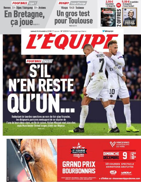 Según informa el diario L'Equipe en su portada de este sábado, el PSG se podría estar planteando la venta de una de sus dos estrellas: Neymar o Mbappé. Pese a que ya aflorasen hace unas semanas las informaciones de Football Leaks en las que se descubrió el trato de favor de la UEFA al club galo y al Manchester City y no haya habido aún sanción alguna, los franceses quieren descartar esta posibilidad en su totalidad.