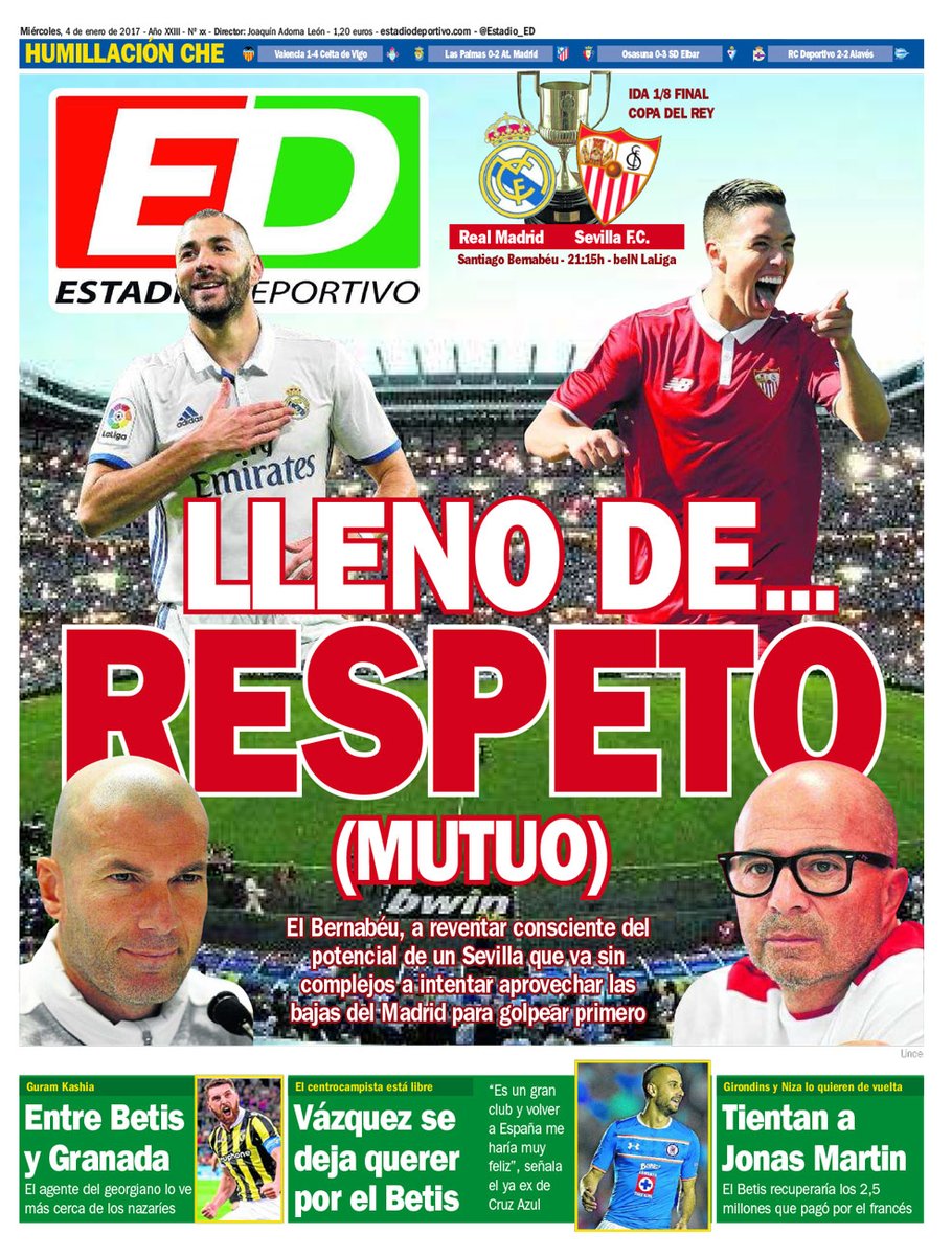 Estadio Deportivo resalta en su portada la disputa del encuentro de ida de octavos de final de la Copa del Rey entre Real Madrid y Sevilla. "El Bernabéu, a reventar, consciente del potencial de un Sevilla que va sin complejos a intentar aprovechar las bajas del Madrid para golpear primero", apunta el diario andaluz.