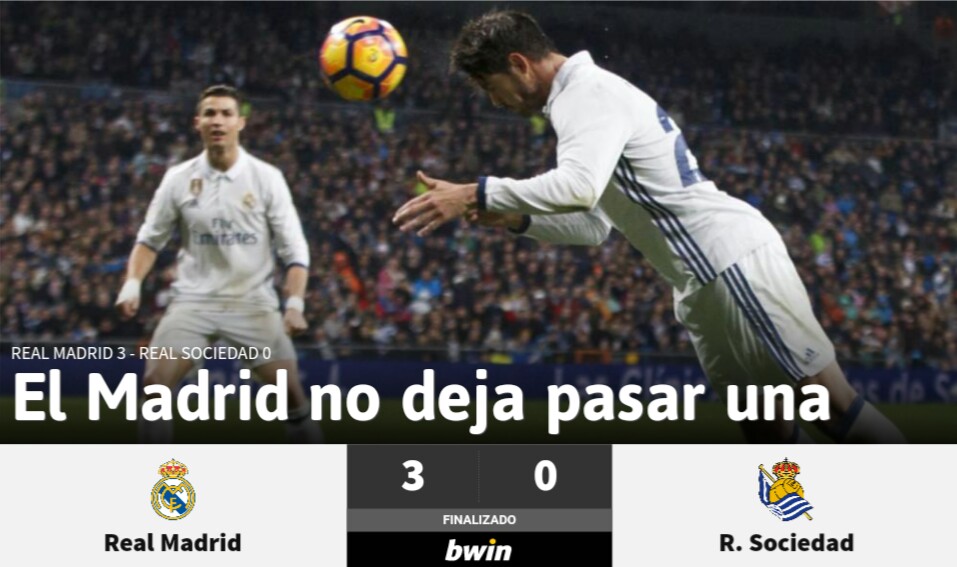 El Real Madrid suma una nueva victoria y el diario AS hace alusión a dicho triunfo madridista sobre la Real Sociedad en su nueva portada de su página web con el siguiente titular: "El Madrid no deja pasar una".