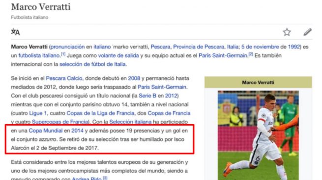 Marco Verratti sufrió tal humillación durante el España Italia por culpa de Isco que hasta la Wikipedia decidió retirarle de la selección transalpina. El madridista hizo lo que quiso con el del PSG y así figuró en la Wikipedia al término del partido. "Se retiró de la selección tras ser humillado por Isco Alarcón el 2 de septiembre de 2017" escribió algún bromista en la enciclopedia libre. Pronto el texto fue modificado.