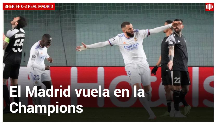 Marca abre su web con el triunfo del Real Madrid contra el Sheriff Tiraspol en la quinta jornada de la UEFA Champions League. Los blancos se aseguran el pase a los octavos de final a falta de una jornada, en la que se jugarán el primer puesto del grupo contra el Inter de Milán.