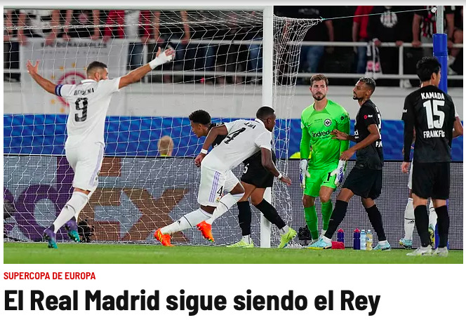 El diario Marca resalta que "el Real Madrid sigue siendo el rey". Y es que los de Carlo Ancelotti ganaron la Champions League y ahora refrendan su hegemonía en Europa ganando la Supercopa en Helsinki. Próxima parada, ¿Mundial de Clubes?