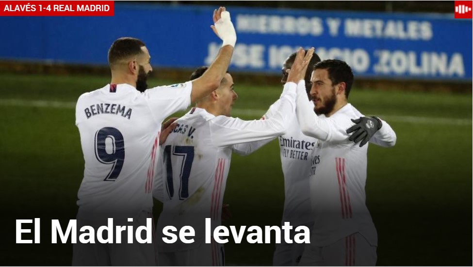 El Real Madrid ha conseguido cuajar uno de los mejores encuentros de la temporada ante el Deportivo Alavés que alivia en gran medida la presión que tenían los de Zidane tras los pobres resultados de los últimos partidos. Un 1-4 al que el diario Marca hacer referencia en su portada: "El Madrid se levanta", afirma el periódico.