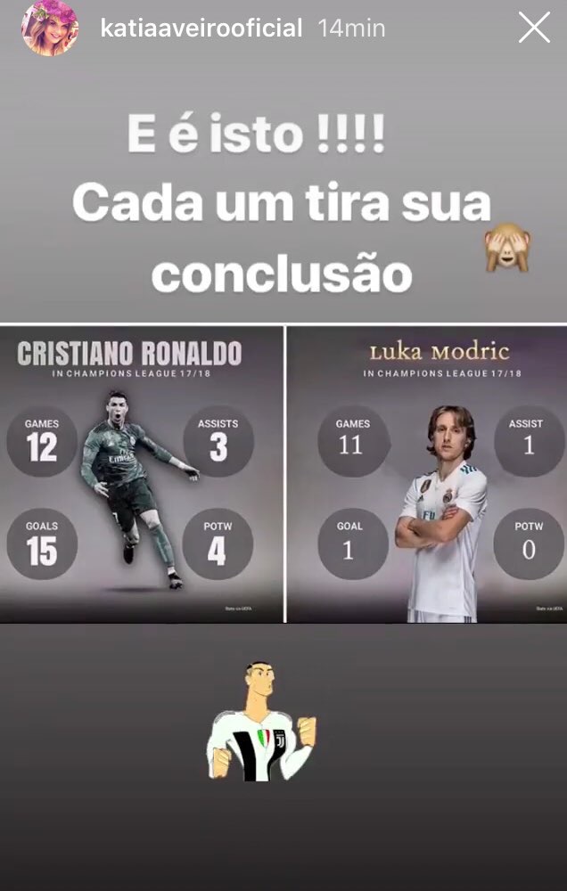 Katia Aveiro, hermana de Cristiano Ronaldo ha compartido en su cuenta de Instagram una histories en la que se puede ver la comparación de su hermano con Luka Modric: "Que cada uno saque su conclusión", adjunto a una imagen donde dónde se pueden ver los partidos, goles y asistencias de cada jugador.