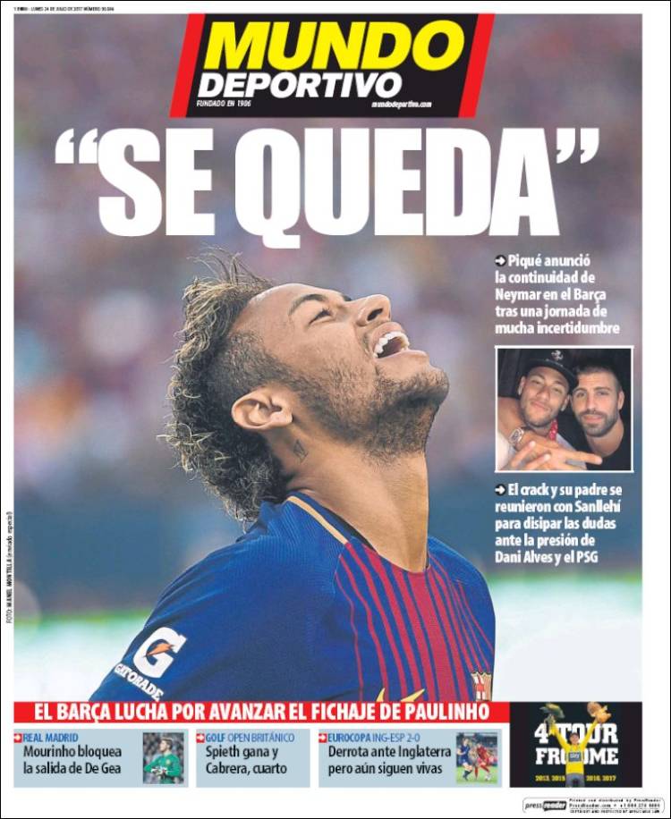 Tanto Sport como Mundo Deportivo publican en su portada el mensaje difundido por Gerard Piqué con Neymar da Silva: "Piqué anuncia la continuidad de Neymar en el Barça. El brasileño aceptaría seguir, el futbolista y su padre se reunieron con el club y todo indica que descartarían su salida hacia el PSG", apuntan