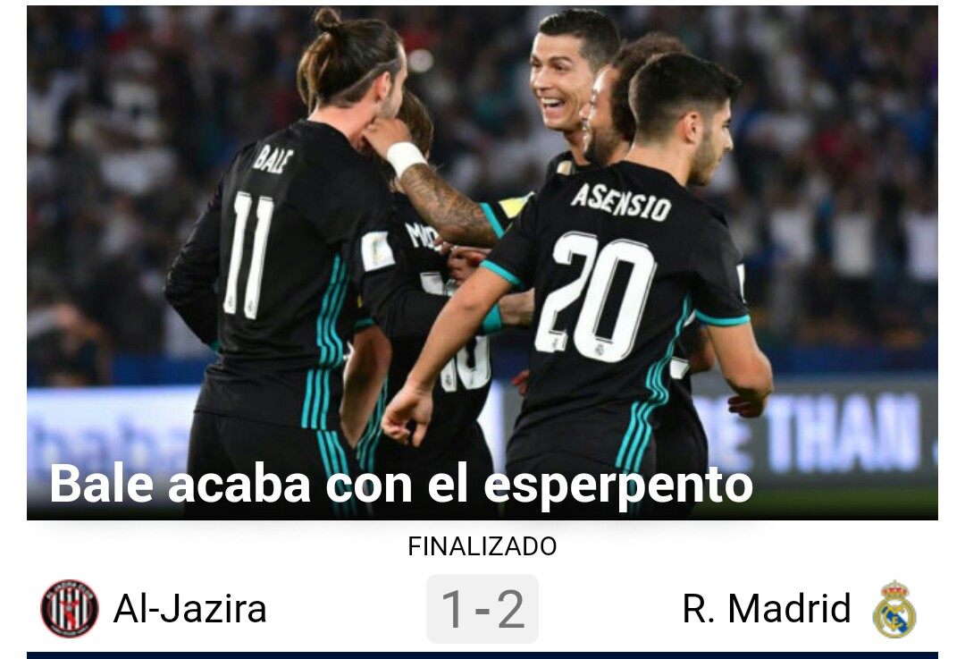 La portada digital del diario Marca define claramente quién ha sido el protagonista que ha llevado al Real Madrid a la final del Mundialito de Clubes. El Real Madrid podrá jugar el próximo sábado frente al Gremio, gracias a Gareth Bale, el galés salió y solucionó un partido que había sido esperpéntico. Cristiano Ronaldo anotó el otro gol del Real Madrid.