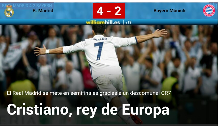 El diario Marca saca en su portada de su página web también a Cristiano Ronaldo. Sin duda, el hombre de la eliminatoria con esos cinco goles que le han dado al Real Madrid el pase a semifinales ante el Bayern. "Cristiano, rey de Europa".