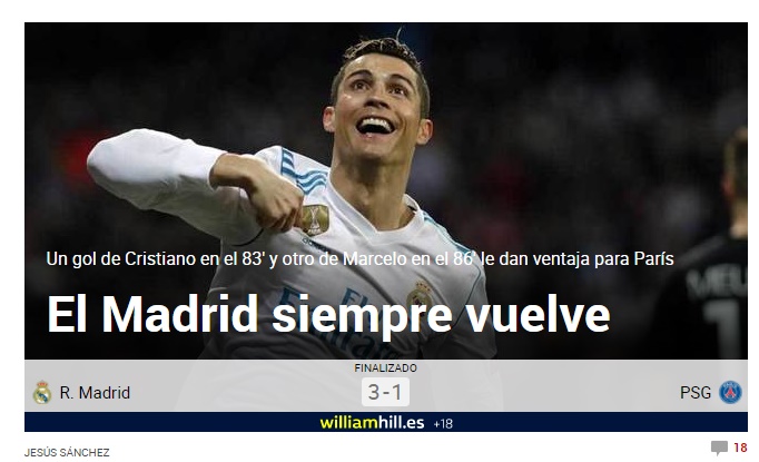 El diario Marca refleja el retorno del equipo de Zidane: "El Madrid siempre vuelve". El Real Madrid ha logrado una victoria importantísima ante el peor rival posible en estos octavos de final de la Champions, el PSG. Los de Emery no han aprovechado las numerosas ocasiones que han tenido, y eso ante el Madrid no lo puedes hacer. Cristiano y Marcelo anotaron los goles blancos.