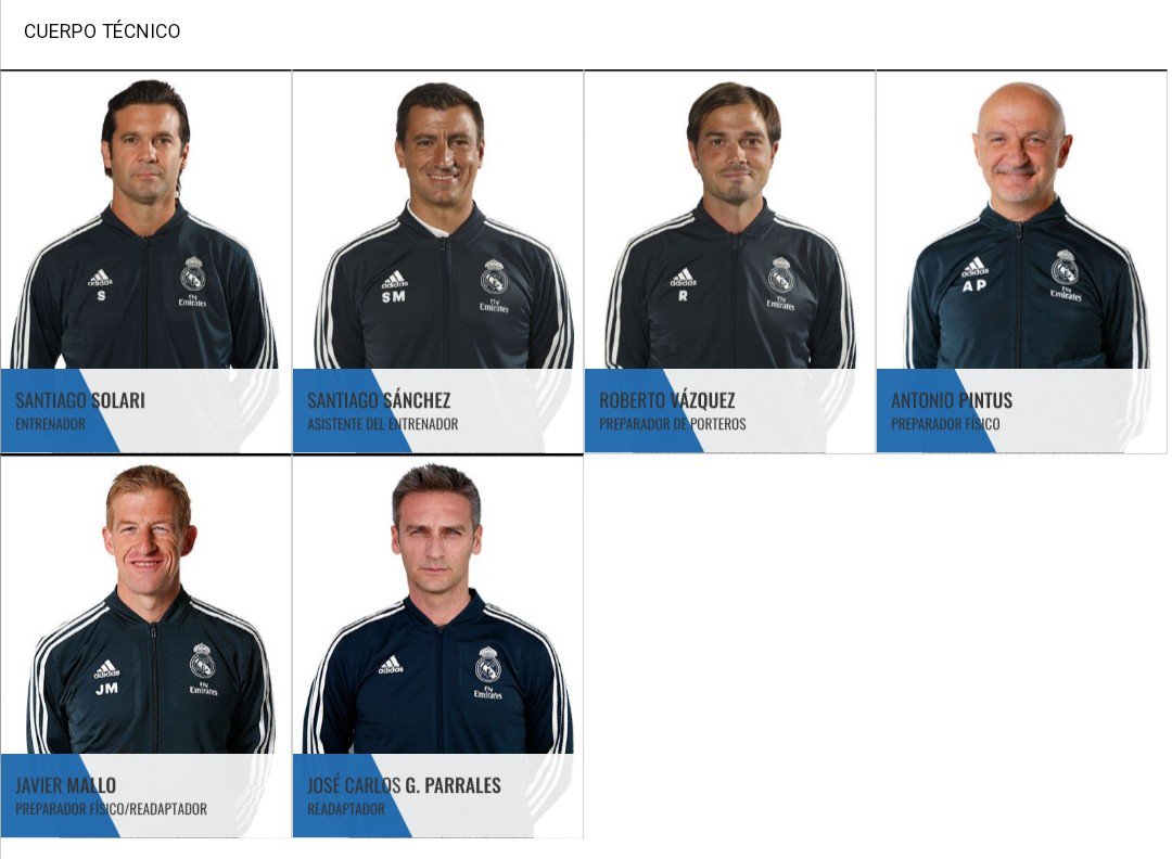 La página web del Real Madrid ya ha actualizado el cuerpo técnico del primer equipo con el nombramiento de Santiago Solari como técnico del primer equipo. En compañía del argentino estarán: Santiago Sánchez como segundo entrenador. Roberto Vázquez como preparador de porteros. Antonio Pintus vuelve a ser el preparador físico. Javier Mallo lo será en el apartado físicoy por último, José Carlos Paredes lo hará como readaptador.
