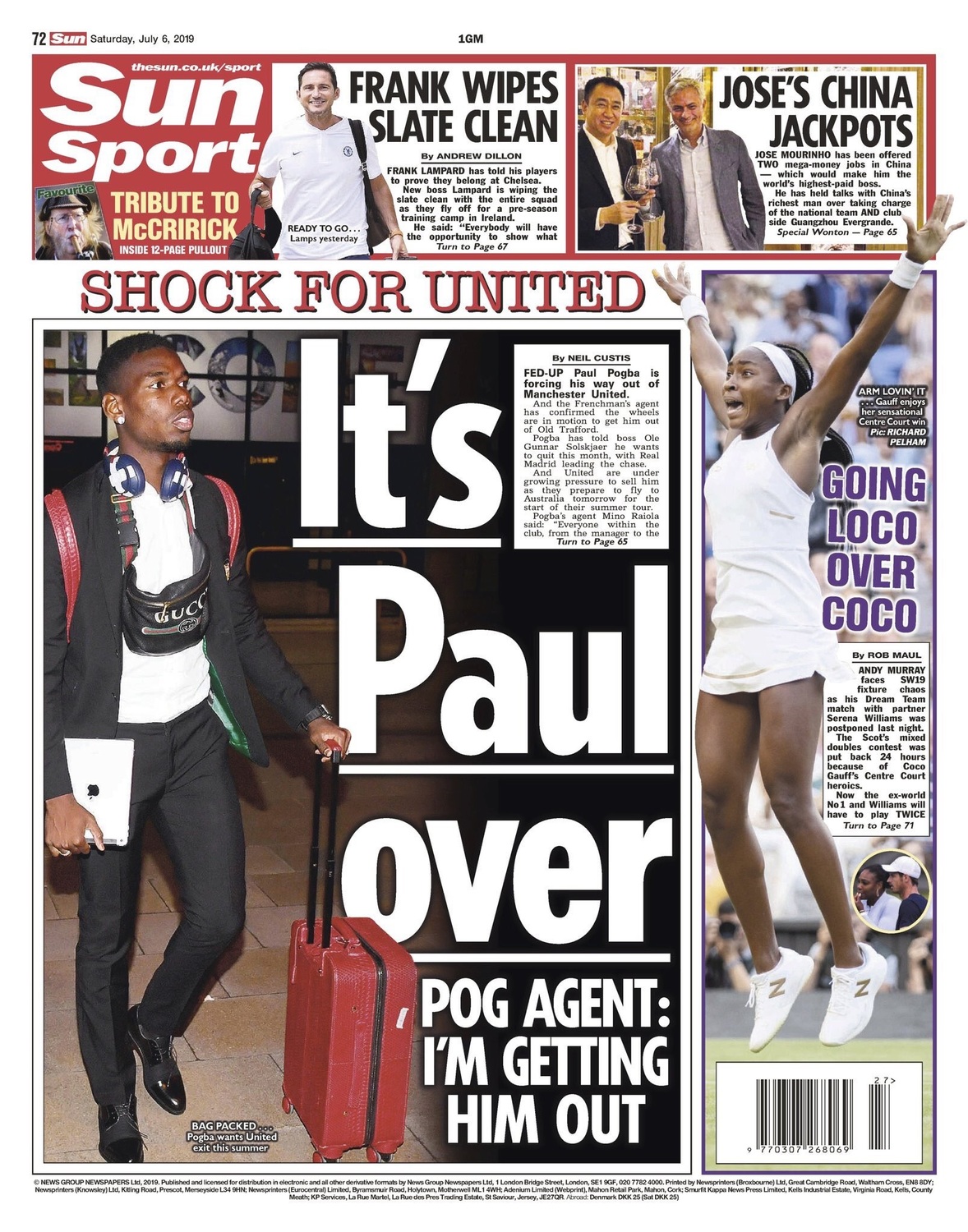 Paul Pogba sigue quemando etapas para llegar al Santiago Bernabéu. El francés comunicó ayer por medio de su representante que todos en el Manchester United son conocedores de su voluntad por marcharse del conjunto 'red devil' este mismo verano. El diario Sun ha salido en su portada del 6 de julio con las palabras de Mino Raiola en las que aseguraba que su cliente está en el proceso para abandonar las islas británicas este mercado de fichajes.