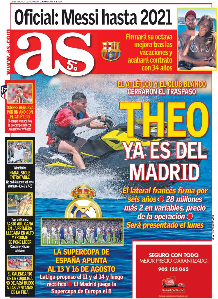 PORTADA - As se hace eco del primer fichaje de los blancos: "Theo ya es del Madrid"