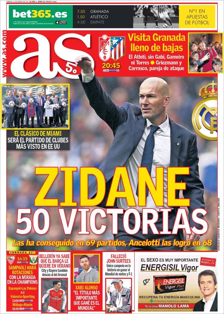 El Diario AS abre hoy sábado 11 de marzo con Zinedine Zidane en portada. El técnico francés es el segundo entrenador en la historia blanca en alcanzar de manera tan efectiva las 50 victorias. Empatado con Muñoz y Mourinho en 69 partidos, es el mejor colocado por el bajo porcentaje en número de derrotas. Solo Ancelotti que lo logró en 68 le supera. El AS también hace referencia al clásico de Miami que se jugará este próximo verano, recalcando que será el partido de clubes más visto en Estados Unidos