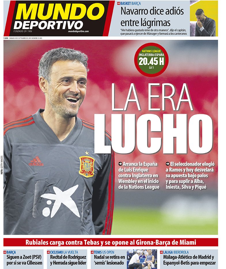 Mundo Deportivo destaca la disputa, esta noche, del encuentro de la UEFA Nations League entre Inglaterra y España: "Arranca la España de Luis Enrique contra Inglaterra en Wembley, en el inicio de la Nations League. El seleccionador elogió a Ramos y hoy desvelará su apuesta bajo palos, y para suplir a Iniesta, Alba, Silva y Piqué", apunta el diario catalán.