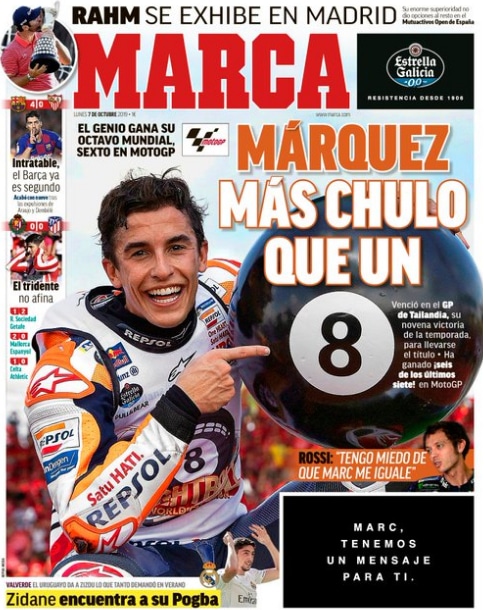 El diario Marca dedica su portada de este lunes a Marc Márquez. El piloto español ha conseguido en Tailandia su octavo título mundial de motociclismo, sexto en MotoGP. En lo referente al Real Madrid, aluden al 'fenómeno Valverde', y es que con la versión del uruguayo ante el Granada, Zidane ha encontrado lo que tanto demandó en verano con Pogba.