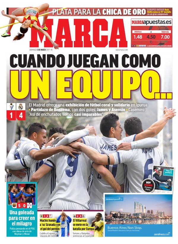En su portada de hoy, el diario Marca destaca la gran victoria del Real Madrid en Ipurúa sin Cristiano Ronaldo y Gareth Bale. El periódico habla de "exhibición" en el 1-4, especialmente por la actuación de Karim Benzema. Tampoco pasa por alto el gran rendimiento de James Rodríguez -que participó en los cuatro goles- o la vuelta de Marco Asensio, que volvió a marcar en Liga.