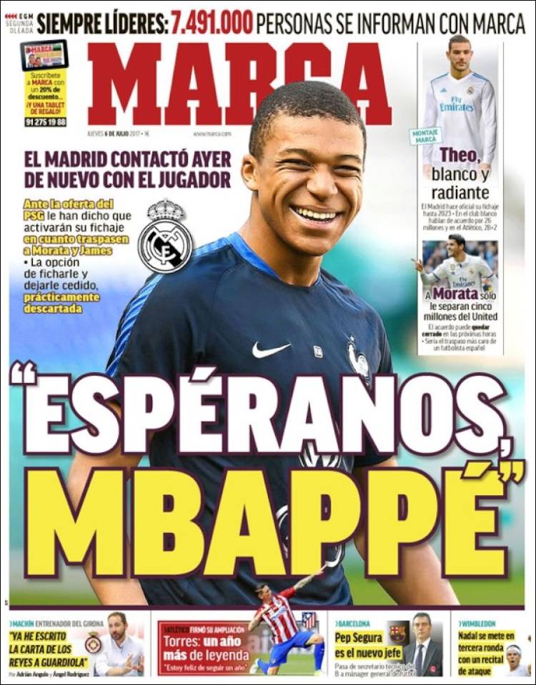 Según Marca, el Real Madrid mantuvo ayer un nuevo contacto con Kylian Mbappé: "Ante la oferta del PSG le han dicho que activarán su fichaje en cuanto traspasen a Morata y a James, la opción de ficharle y dejarle cedido, prácticamente descartada", apunta el diario de la Capital.