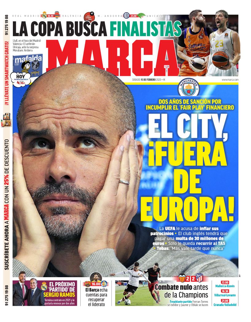 Marca destaca en su portada de hoy, 15 de febrero, la posible renovación de Sergio Ramos hasta 2023. El camero tiene contrato hasta el próximo verano, pero no le importaría renovar dos temporadas más para sellar su vínculo con la entidad blanca aún más si cabe. Además el diario comenta en la parte central la sanción al Manchester City.