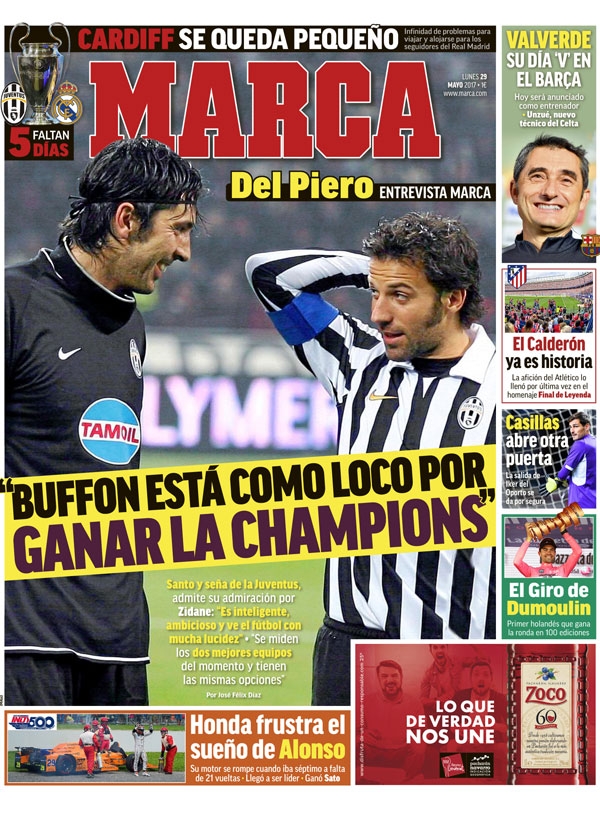 El periódico Marca muestra en portada una fotografía de dos leyendas de la historia moderna de la Juventus de Turín con Buffon acompañado de Alessandro Del Piero. En la entrevista al exfutbolista, el italiano lo confiesa: "Buffon está como loco por ganar la Champions". También opina sobre Zidane: "Es inteligente y ve el fútbol con mucha lucidez". Sobre la final recalca: "Se miden los dos mejores equipos del momento y tienen las mismas opciones". Por otro lado, el periódico dedica espacio a la inminente llegada de Valverde al Barcelona, la despedida del Calderón y el futuro de Iker Casillas.