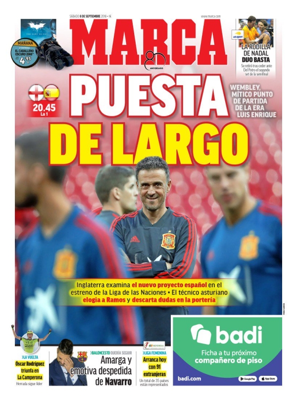 Marca destaca el estreno a nivel competitivo de Luis Enrique como seleccionador de España: "Wembley, mítico punto de partida de su era. Inglaterra examina el nuevo proyecto español en el estreno de la Liga de las Naciones. El técnico asturiano elogia a Ramos y descarta dudas en la portería", apunta el rotativo de la Capital.