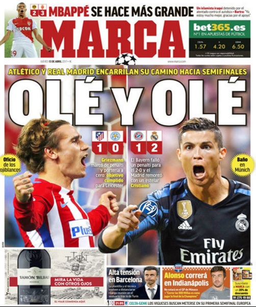 El diario Marca abre hoy con una portada ecuánime entre el Atlético de Madrid y el Real Madrid. Los dos clubes de la capital, liderados por Antoine Griezmann y Cristiano Ronaldo, lograron imponerse en la ida de sus eliminatorias de sus cuartos de final y son favoritos para plantarse en la siguiente ronda.