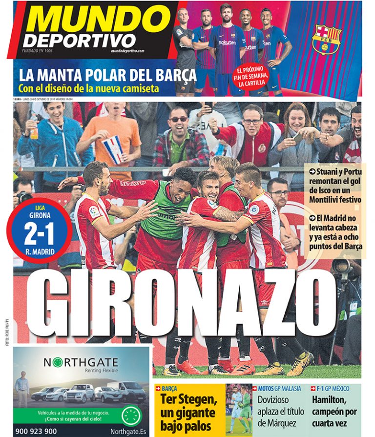 Mundo Deportivo destaca en su portada la victoria del Girona FC ante el Real Madrid: "Stuani y Portu remontan el gol de Isco en un Montilivi festivo, el Madrid no levanta cabeza y ya está a ocho puntos del Barça", apunta el diario catalán.