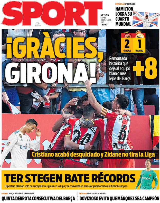 Sport dedica su portada a la victoria del Girona FC ante el Real Madrid. "Remontada histórica que deja al equipo blanco más lejos del Barça. Cristiano acabó desquiciado y Zidane no tira la Liga", apunta el rotativo barcelonés.