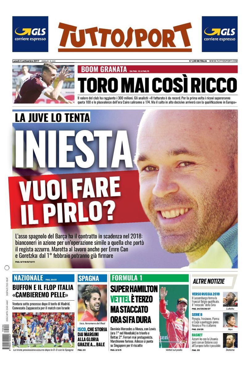 PORTADA - Tuttosport lanza una tentativa para Iniesta: "¿Quieres ser el nuevo Pirlo?"