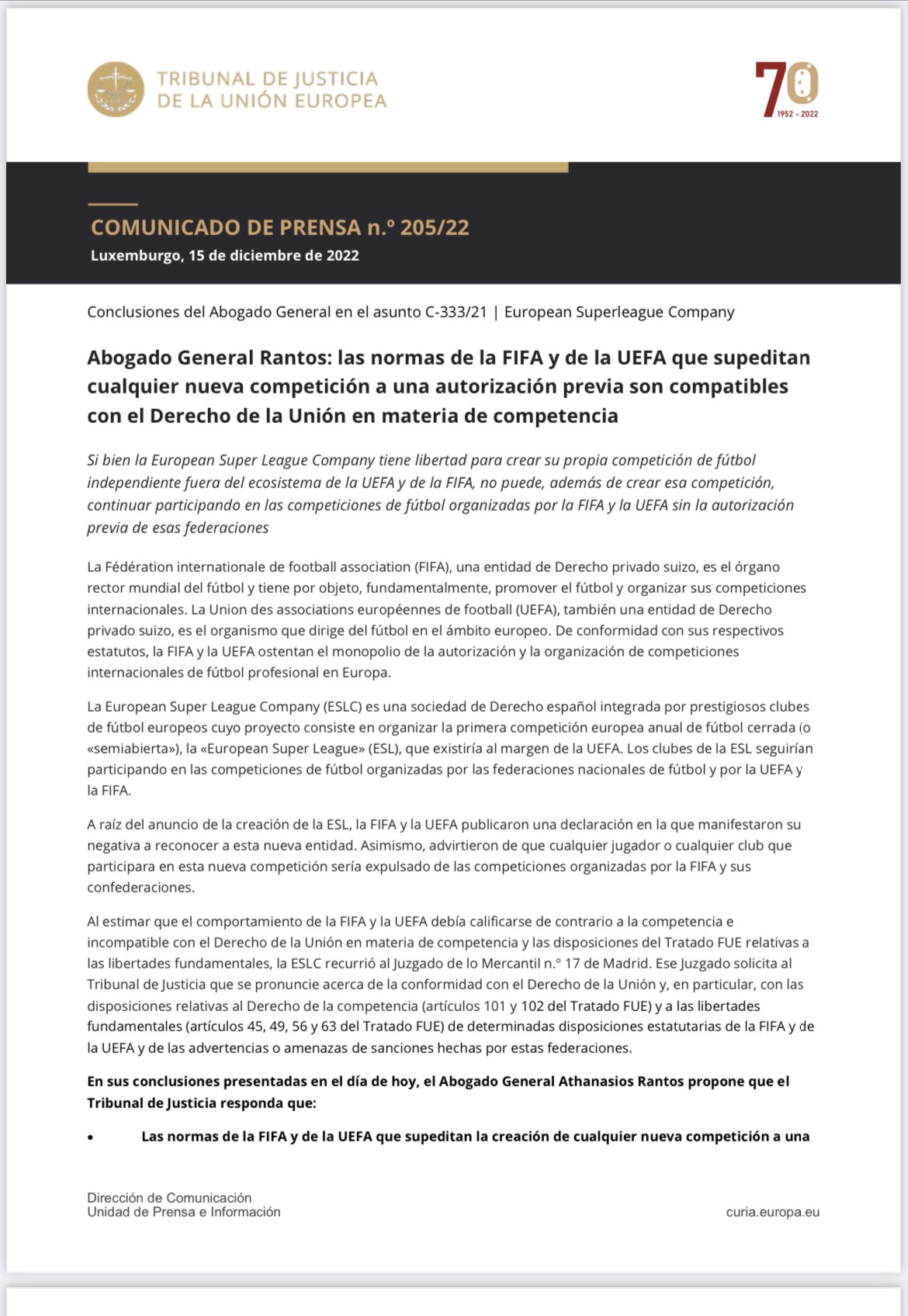 Este jueves, Athanasios Rantos, abogado general del Tribunal de Justicia de la Unión Europea, ha publicado su opinión sobre la Superliga y considera que la UEFA y la FIFA pueden vetar en sus competiciones a los participantes del proyecto que lideran Real Madrid, Juventus y FC Barcelona. “Si bien la European Super League Company tiene libertad para crear su propia competición de fútbol independiente fuera del ecosistema de la UEFA y de la FIFA, no puede, además de crear esa competición, continuar participando en las competiciones de fútbol organizadas por la FIFA y la UEFA sin la autorización previa de esas federaciones”, asegura el abogado.