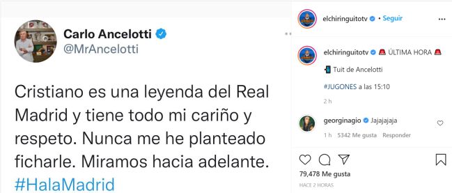 Carlo Ancelotti decidió hace algunas horas desmentir la llegada de Cristiano Ronaldo al Real Madrid: "Cristiano es una leyenda del Real Madrid y tiene todo mi cariño y respeto. Nunca me he planteado ficharle. Miramos hacia adelante", apuntó el estratega italiano. Este mensaje ha sido compartido también por la cuenta oficial de Instagram de El Chiringuito de Jugones, en la cual ha publicado la novia de Cristiano un escueto: "Jajajaja".