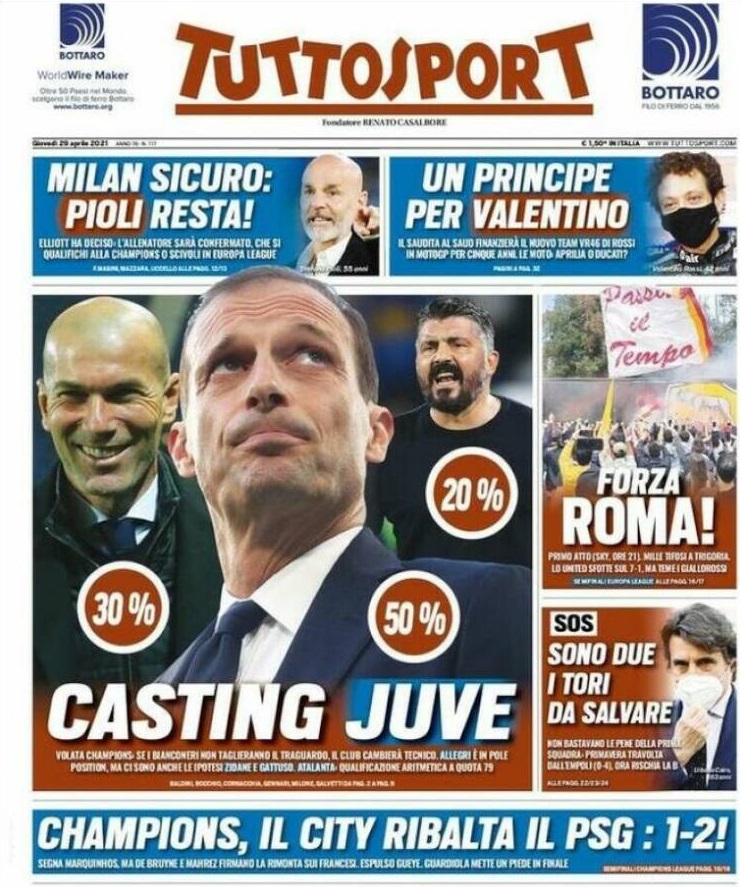 El favorito sería Massimiliano Allegri, a quien el citado medio le da un 50% de posibilidades de ser el nuevo entrenador de la 'Vecchia Singora'. En segunda posición aparece Zidane con un 30%, y finalmente Gattuso -actual técnico del Nápoles- con un 20%.