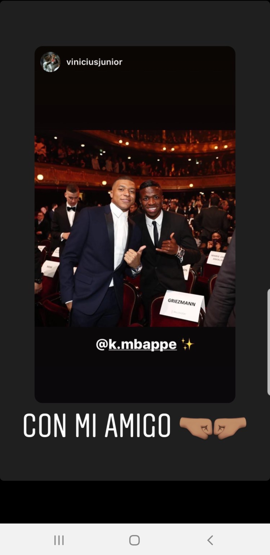 Tras subir el otro día una imagen a sus redes sociales en la que devolvía los aplausos a la gente del Santiago Bernabéu, en esta ocasión ha publicado una fotografía en la que posa con Vinícius durante la gala del Balón de Oro. El francés llamó "amigo" al brasileño, y este último respondió tildándole de "crack". Buena sintonía entre dos jugadores que podrían marcar el futuro del Real Madrid. 'Vini' terminó cuarto en el premio Kopa, entregado por Kylian, que a su vez finalizó sexto en la máxima categoría del galardón de France Football.