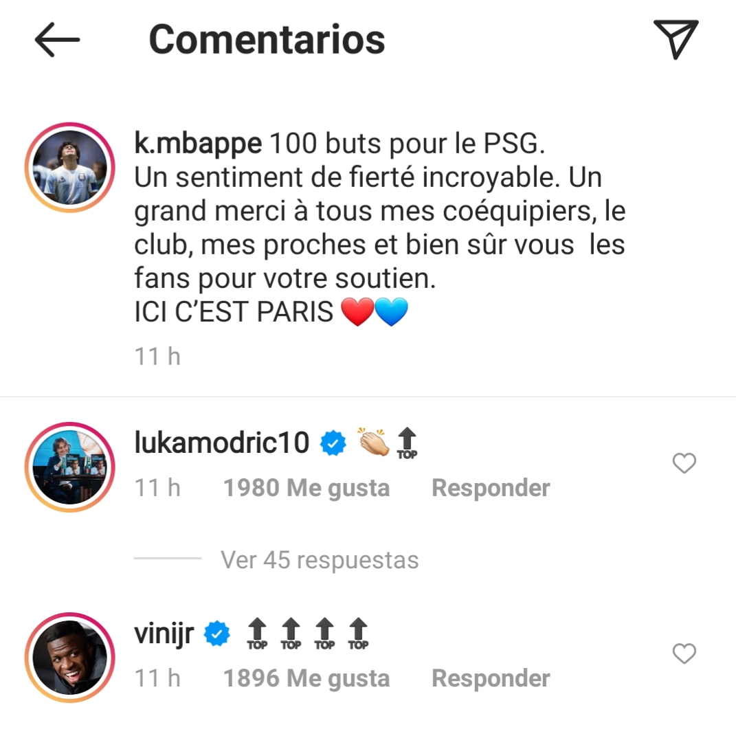 En medio de todos los rumores que vinculan a Kylian Mbappé con el Real Madrid, dos futbolistas del conjunto blanco lanzaron un guiñito al delantero francés que este sábado frente al Montpellier (1-3) marcó su gol número 100 con el Paris Saint-Germain. El crack galo festejó dicha cifra en Instagram con un post con el que se mostró muy orgullo de estar en el equipo bretón y en el que comentó: "100 goles para el PSG. Un sentimiento de orgullo increíble. Muchas gracias a todos mis compañeros, al club, a mis seres queridos y, por supuesto, a todos los fans por su apoyo. Esto es París". Una publicación que, curiosamente, gustó a Luka Modric y Vinicius Junior, quienes comentaron en la publicación del parisino. El brasileño contestó con cuatro emojis de 'TOP' y el croata con uno de aplausos y otro de TOP.