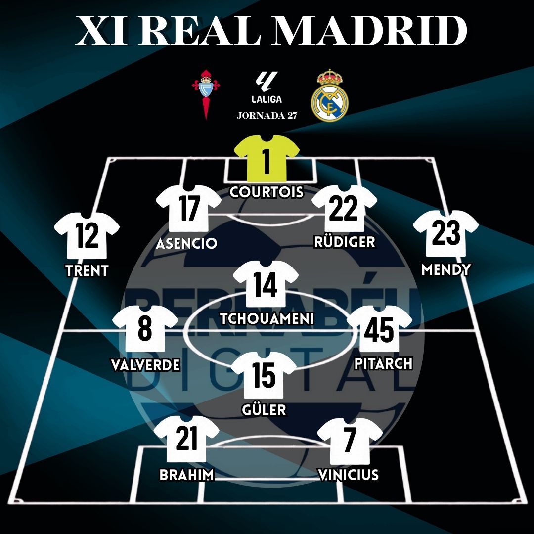 ¡Ya tenemos alineación del Real Madrid! El equipo de Álvaro Arbeloa buscará los tres puntos contra el Celta de Vigo con Courtois bajo palos; Trent, Asencio, Rüdiger y Mendy en defensa; centro del campo para Tchouaméni, Pitarch, Fede Valverde y Arda Güler; y arriba,Vinicius y Brahim.
