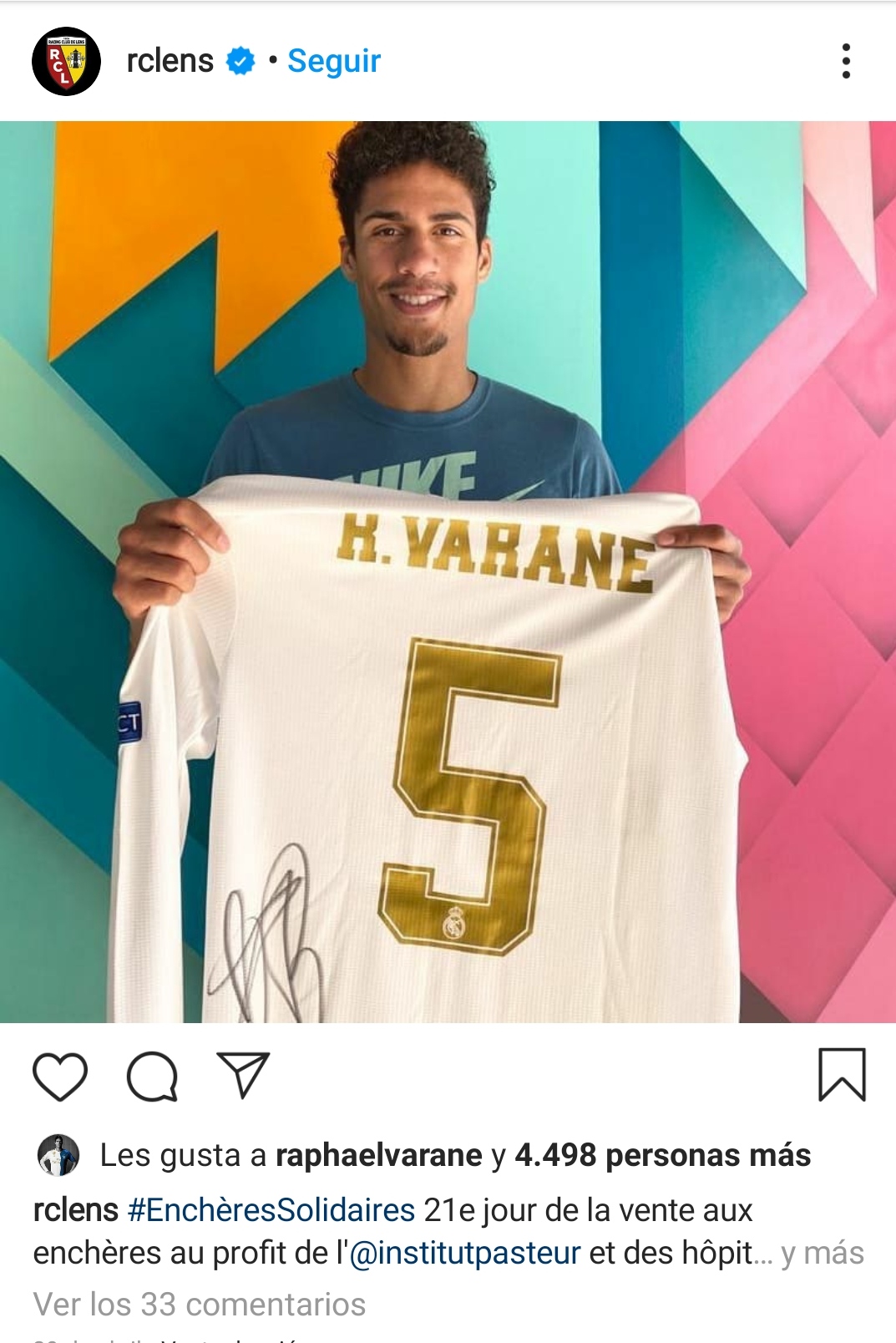 Varane subasta una de sus camisetas y destinará más de 4.000 euros a los hospitales de Lens