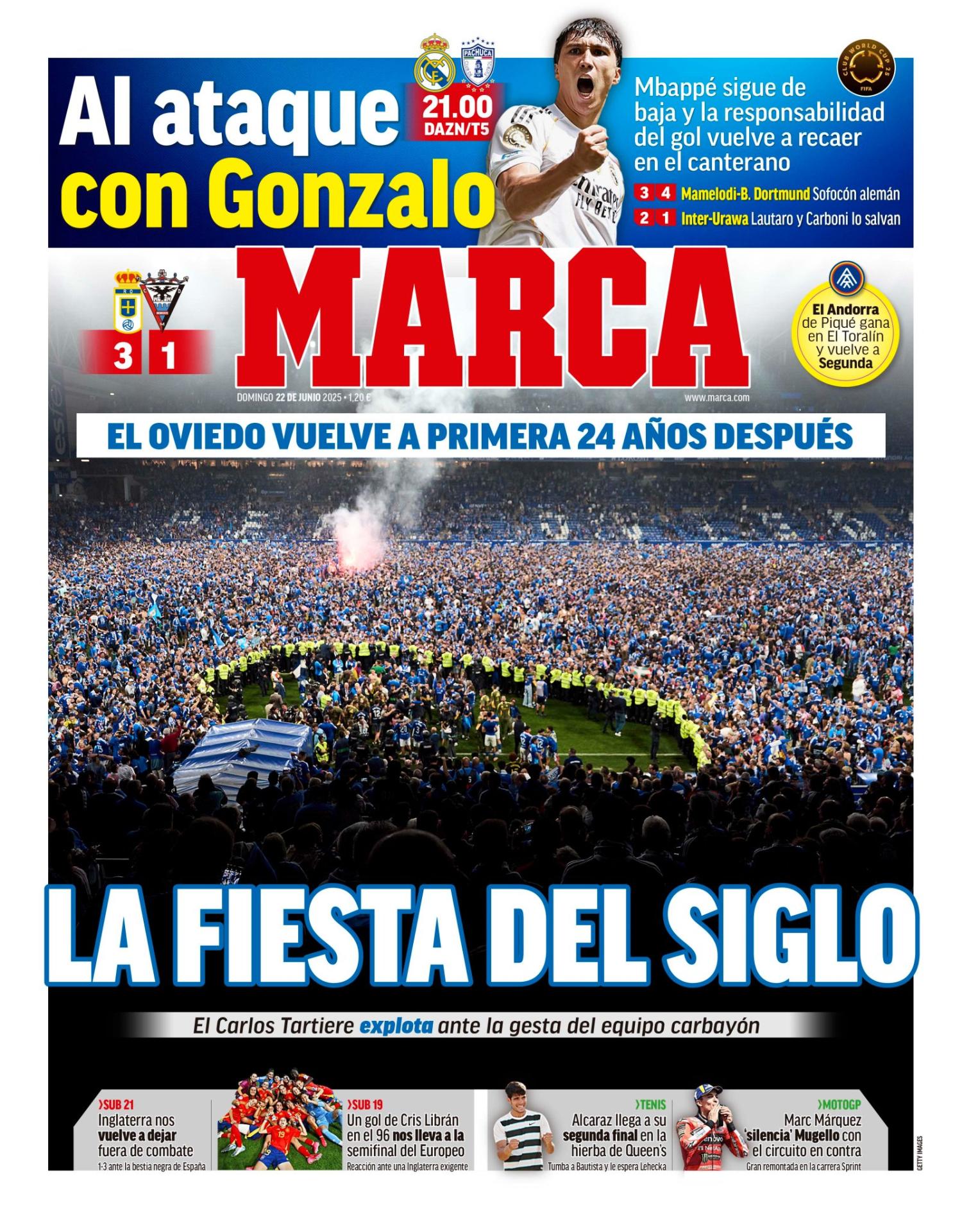 Marca destaca en su primera plana el partido que enfrenta a esta noche al Real Madrid con el Pachuca en la segunda jornada de la fase de grupos del Mundial de Clubes. Además, destacan el ascenso del Oviedo.