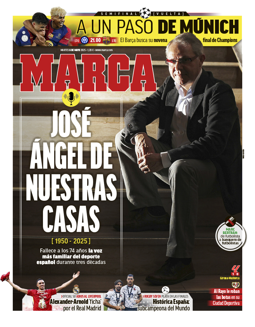 El diario Marca destaca en su primera plana el fallecimiento de José Ángel de la Casa. También destacan el anuncio de la salida de Alexander-Arnold del Liverpool.