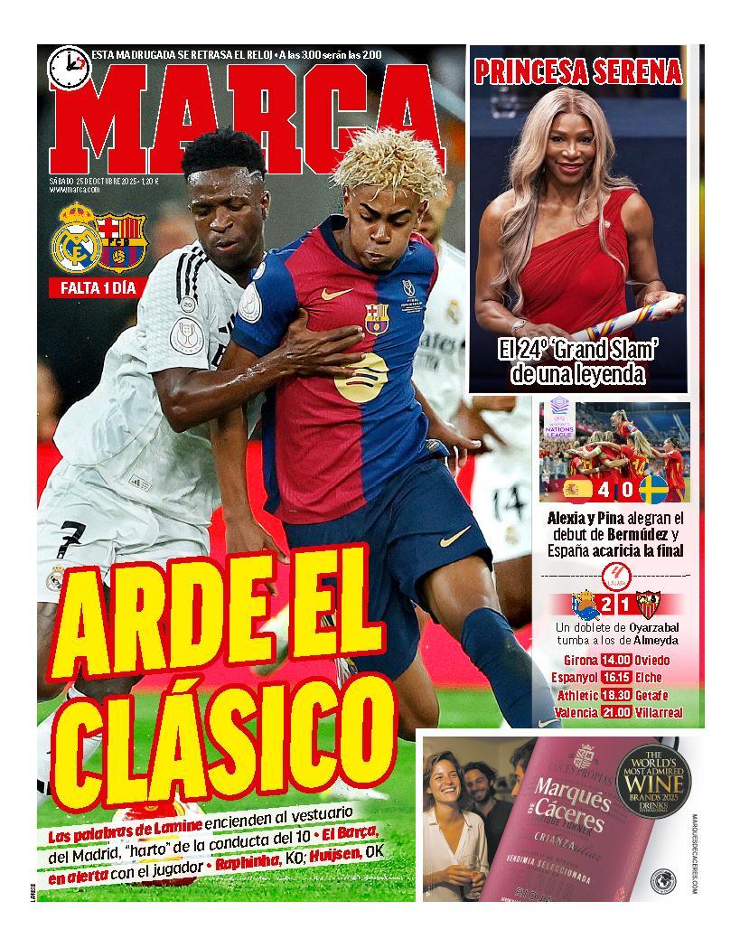 El diario Marca destaca en su portada del sábado 25 de octubre la previa del clásico entre el Real Madrid y el Barcelona de este domingo. Todo tras las palabras de Lamine Yamal, que han encendido al vestuario madridista.