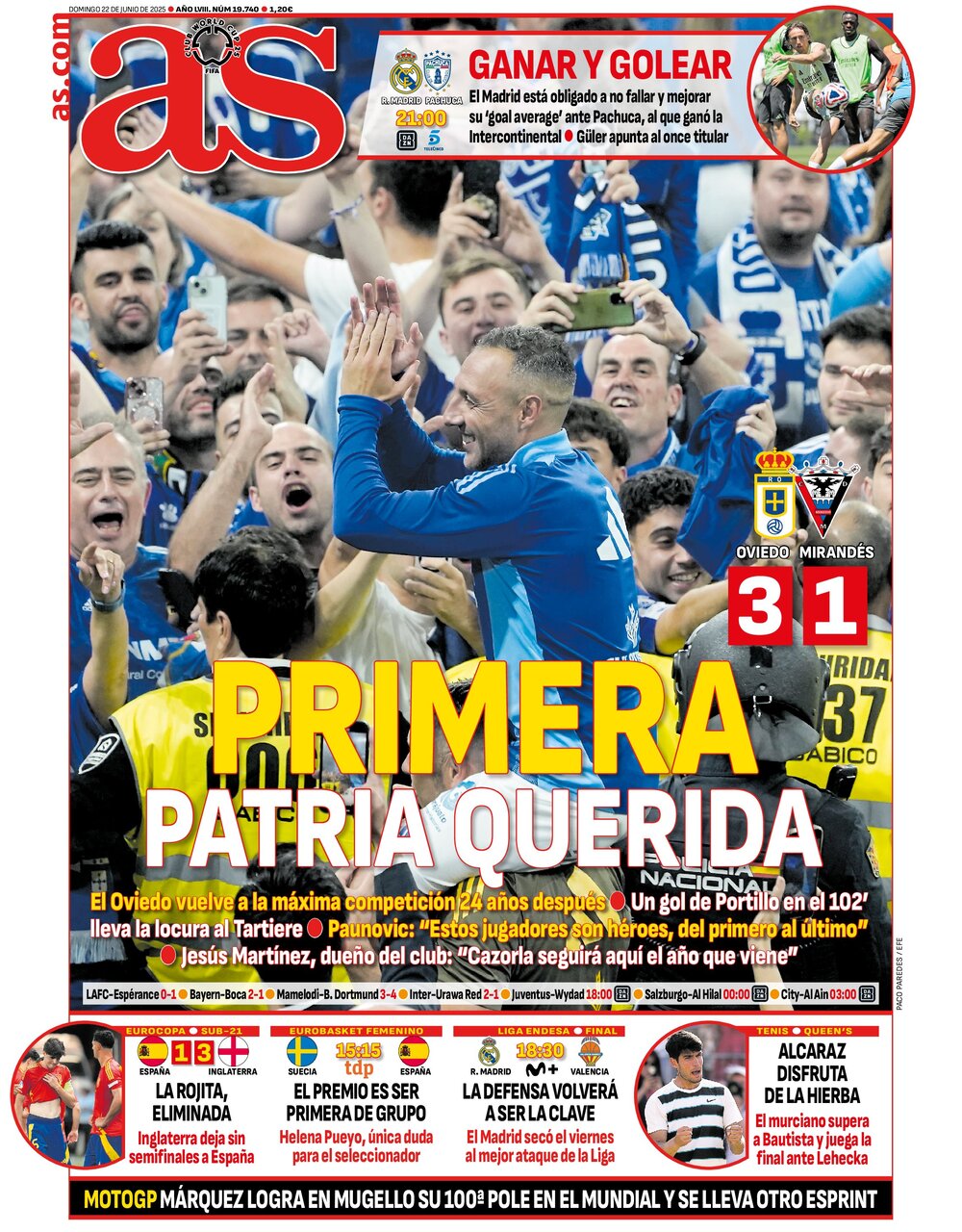 El diario AS destaca en su portada la previa del segundo partido del Mundial de Clubes que enfrentará al Real Madrid con el Pachuca en el Bank of America de Charlotte. También destacan el ascenso del Oviedo.