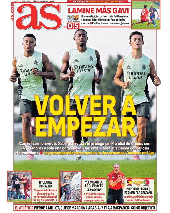 El diario AS destaca en su primera plana el primer entrenamiento del Real Madrid a las órdenes de Xabi Alonso. El conjunto blanco regresa de sus vacaciones y ya piensa en el primer partido de LaLiga.