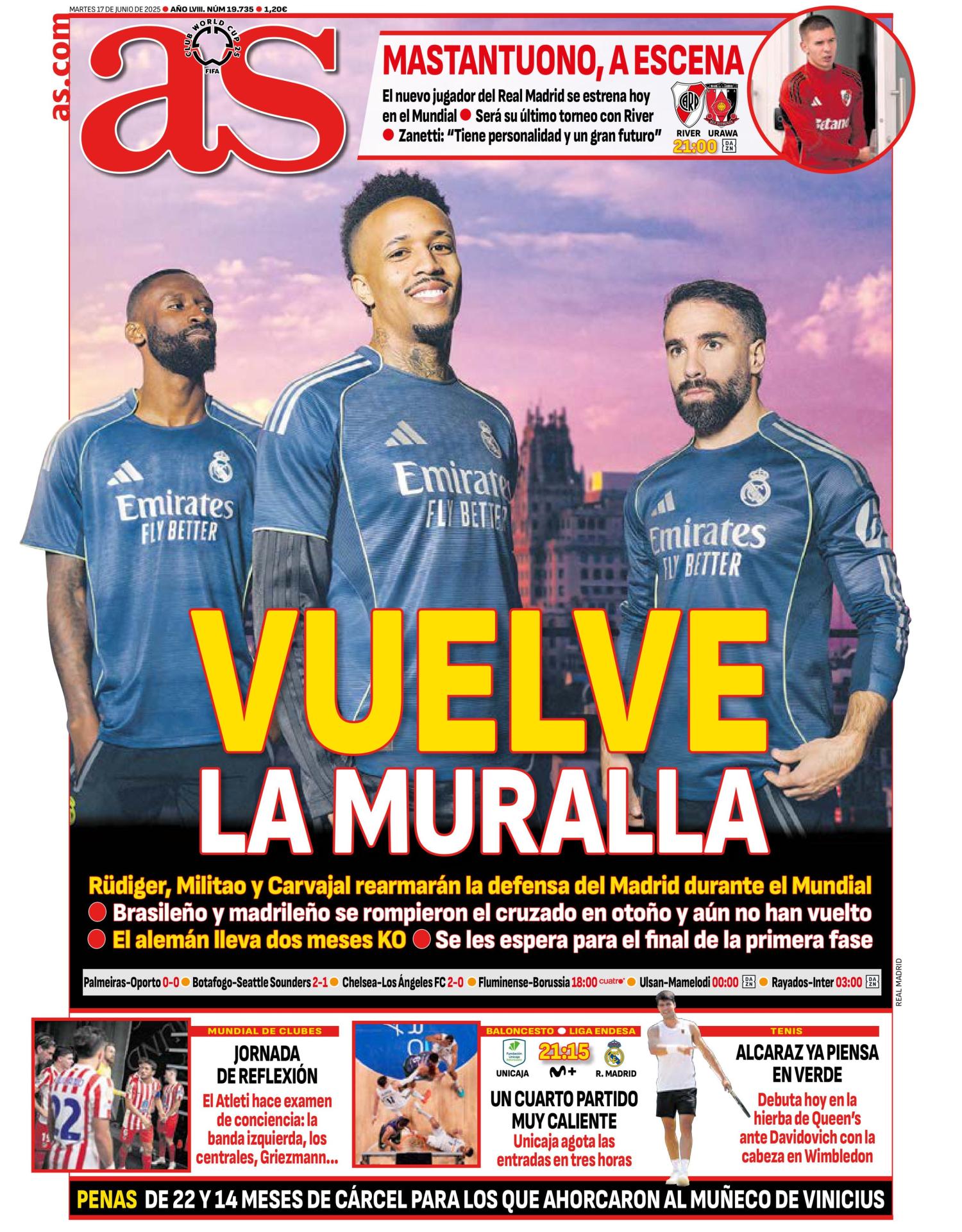 El diario AS abre con el regreso de Rüdiger, Militao y Carvajal para este Mundial de Clubes con el Real Madrid tras superar todos ellos las distintas lesiones que han sufrido.