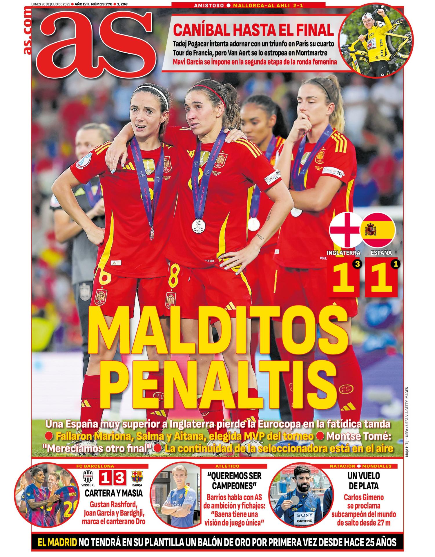 El diario AS publica en su portada la derrota de España en la final de la Eurocopa femenina en la tanda de penaltis. Inglaterra revalida su título de campeón europeo.